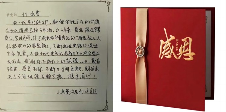 感謝卡:每一份平凡的工作,都能創(chuàng)造不凡的價值,你加入海陵已經(jīng)3年啦,這3年來一直扎根在包裝崗位,歲月更替,你已成長為包裝崗位的“崗位放心人”。積極努力地帶教新人,不斷地在實踐中保證產(chǎn)品質(zhì)量,不斷地為更多的患者生產(chǎn)出符合要求的藥品。感謝你在崗位上的兢兢業(yè)業(yè),勤奮踏實,感恩有你,不斷為車間貢獻,期待未來與車間繼續(xù)同頻共振,攜手同行!